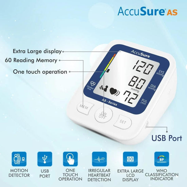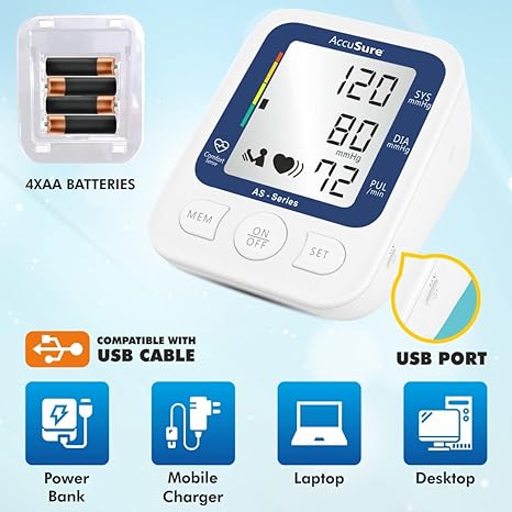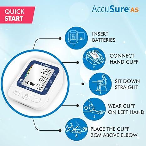 *Box Contents: BP Monitor | Universal Arm Cuff | 4 x AAA Alkaline Batteries | Instruction Manual | Warranty Card.; Note: AccuSure AS Blood Pressure Monitor comes with 4 year warranty. Please read the instruction manual for better measurement before using the BP monitor